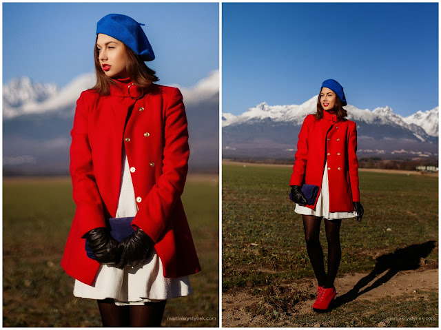 Topánky: čínsky obchod, Silonky: Bepon, Šaty: Second-hand, Rolák: Mango, Kabát: Mango, Kabelka: Camaieu, Rukavice: Poľsko, Baretka: House