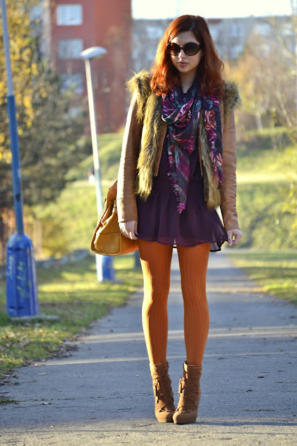 Topánky: Poľsko, Silonky: Takko, Šaty: Second-hand (Primark), Šatka: H&M, Vesta: Second-hand, Bunda: Orsay, Taška: Taliansko, Okuliare: Tally Weijl